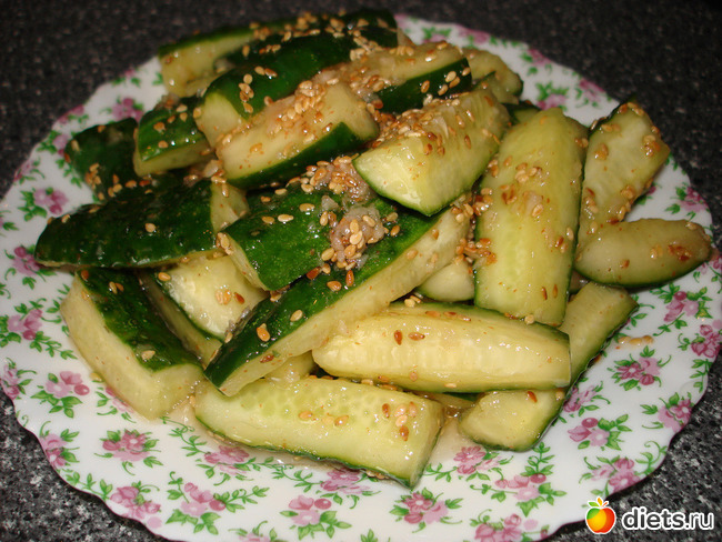 Растительное масло раскалите на сковороде, затем снимите сковороду с плиты. Быстро всыпьте в масло кунжутное семя, дождитесь когда кунжут изменит цвет на коричневый (это происходит очень быстро). Влейте раскаленное масло с кунжутом в огурцы и перемешайте.