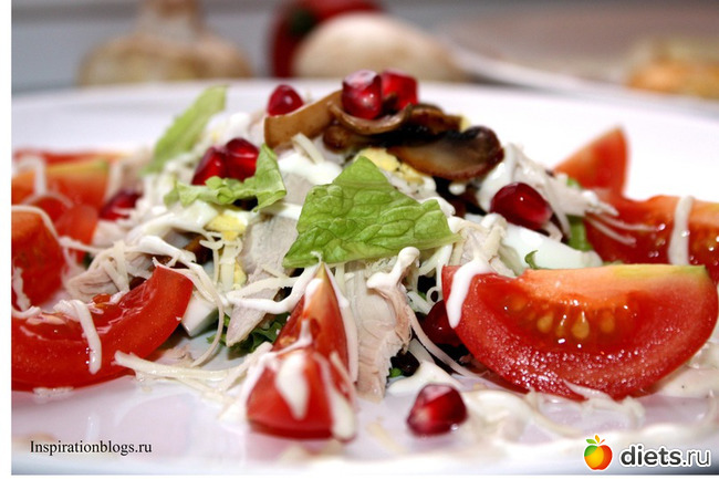 1) Берем заранее отварную грудку или же варим ее, салат рвем на мелкие кусочки, грибы режем ломтиками и тушим без масла, грудку режем ломтиками;