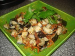 Взбить яйца, баклажаны очистить ( я не очищала), нарезать кубиками. Баклажаны смешать с яйцами, поставить в холодильник на 3 часа ( можно на ночь)морковь натереть(я нарезала соломкой) и лук (нарезать кубиками) обжарить на раст. масле. Добавить баклажаны с яйцами, перемешать. Если сухова-то добавить немного масла, посолить, поперчить. Жарить до готовности. Минут за 5 доконца можно добавить укроп(у меня без). Чеснок мелко порезать, положить в баклажаны, перемешать прикрыть крышкой и сразу выключить огонь. Дать немного остыть. Можно подать с майонезом(и без него вкусно очень).