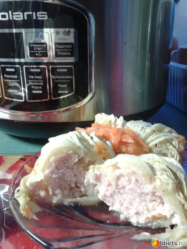 Голубцы Хочу поделиться рецептом. Нашла в нете, но сама делаю впервые... Моим домашним понравилось очень!!! Ушло на УРА!!! Все банально просто.. Фарш из куриной грудки и бедрышек, плюс репчатый лук, чеснок, соль, перец, можно укропчика покрошить... Вся фишка в капусте!!! Она Пекинская... Даже не бланшировала в кипятке... Просто отрезала пяточку, срезала белые уплотнения и слегка отбивала молоточком и завернула... Тушила в мультиварке, пересыпав морковью и лучком...минут 40-50...воду добавила пару капель, можно и не добавлять...и так жидкости много получилось... Бульончик кстати то же в дело пошел... Рецепт для БО.