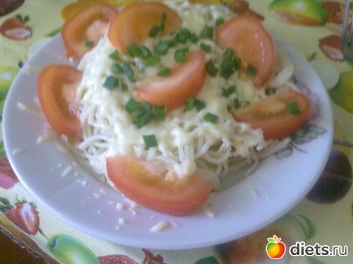 Спагетти (к сожалению, не из твердых сортов: мужу не объяснить их достоинства) с сыром и помидором