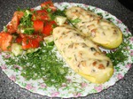 Жульен в кабачках Кабачки разрезать и удалить мякоть, чтобы получились лодочки. Заранее подготовить начинку:порезать курочку, лук полукольцами и шампиньоны, быстро все обжарить, посолить и поперчить, влить сливки, как только начнет густеть, выложить начинку в лодочки и в духовку при 180гр. минут 30-40, минут за 10 до конца посыпать хорошо натертым сыром и дать расплавиться