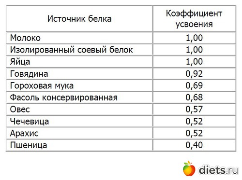 качество пищевых белков оценивают по коэффициенту их усвоения. Он учитывает аминокислотный состав (химическую ценность) и полноту переваривания (биологическую ценность) белков. Продукты, имеющие коэффициент усвоения равный 1,0, являются наиболее полноценными источниками белка. Оценка качества белков различных продуктов по данным ВОЗ приведена в таблице.