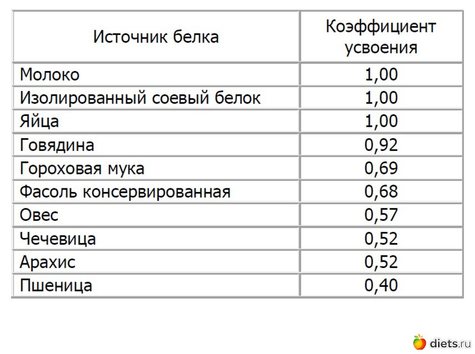 качество пищевых белков оценивают по коэффициенту их усвоения. Он учитывает аминокислотный состав (химическую ценность) и полноту переваривания (биологическую ценность) белков. Продукты, имеющие коэффициент усвоения равный 1,0, являются наиболее полноценными источниками белка. Оценка качества белков различных продуктов по данным ВОЗ приведена в таблице.