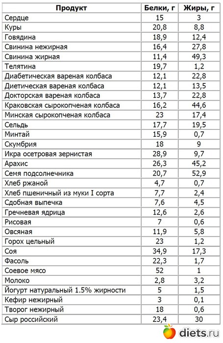 Приведем таблицу содержания белка и жира в 100 граммах в некоторых продуктах, богатых белком.
