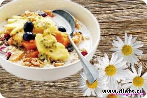 Швейцарские мюсли. ½ стакана овсяных хлопьев смешать с 2 ст.л. ростков пшеницы, залить ¾ стакана яблочного сока и оставить на несколько часов или на ночь в холодильнике. С утра добавить к смеси тертое яблоко, сбрызнутое лимонным соком, мелко нарезанную грушу и ½ стакана натурального йогурта. Подсластить такие мюсли можно медом или кленовым сиропом.
