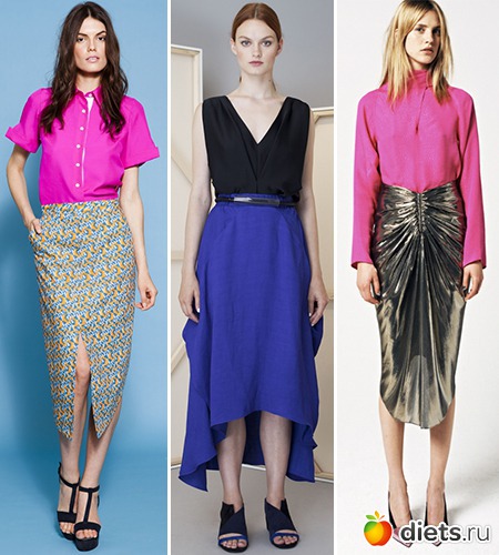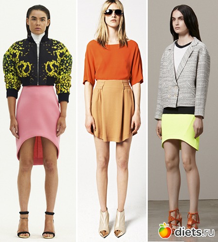 Что же до остальных расцветок, то весьма востребованными летом 2013 будут все оттенки розового, оранжевого, салатового и других ярких жизнерадостных цветов. Об этом свидетельствуют красочные асимметричные юбки в коллекциях брендов Josh Goot, See by Chloe и Antonio Berardi.