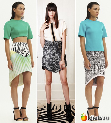 Популярные бренды Josh Goot и Kelly Wearstler предлагают своим поклонницам остановить свой выбор на моделях юбок, которые украшают самые разнообразные животные принты, а так же расцветка в стиле милитари и мелкие геометрические рисунки. Приветствуется сочетание ярких цветных элементов с мелкими черно-белыми изображениями.