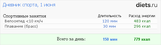 1 июня, спорт Хотя ехали на велосипеде медленно, зато долго. А вечером еще и бассейн. Даже не ожидала, что это съедает столько калорий. Так что мои капкейки и коктейли испарились ))