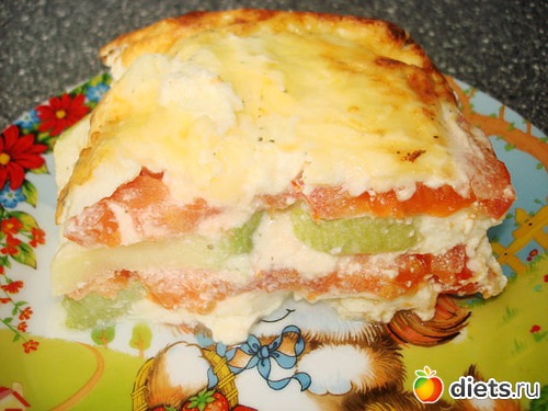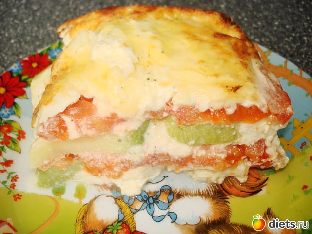 Для заливки все смешать, добавить тертый сыр и чеснок. В форму укладываем слоями, овощи соус повторяем пока все не закончится, посыпаем еще немного сверху сыром и в духовку минут на 30-40 при 180гр.до румяной корочки, можно так же сделать с баклажанами или добавить отварную курочку