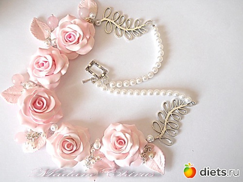 Очень нежное, современное колье. Крупные розы в украшение, покрыты натуральным перламутром. Розовый кварц, жемчуг сваровски, натуральный чешский жемчуг. Придают украшению роскошный вид.