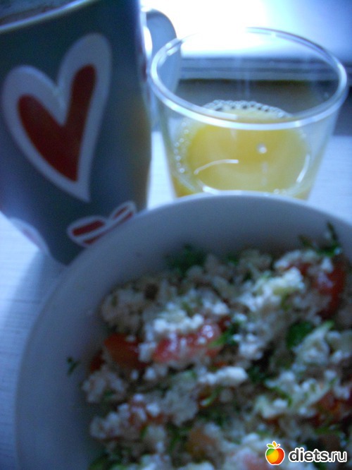 1-й завтрак - сок, кофе, творожок с овощами - огурцом, помидором, зеленью: