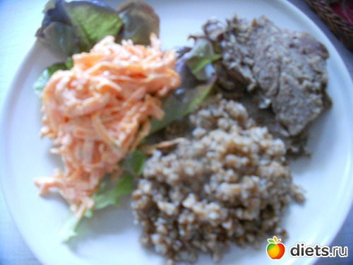 Обед - суп из чечевицы (1 сложные углеводы) + отварная говядина, гречка, морковка с чесноком и йогуртом (1 злаки, 1 овощи, 1 белок):