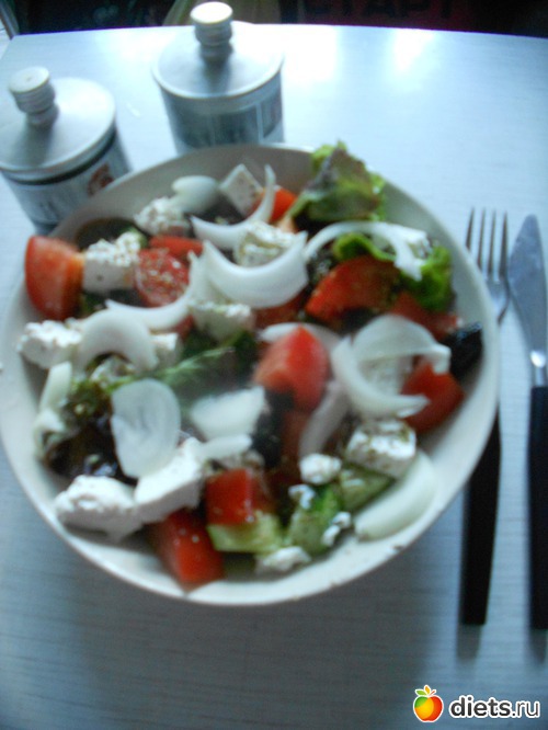 Ужин - греческий салат (1 овощи, 1 белок), уже без хлеба (1 сложные углеводы ушли на суп):