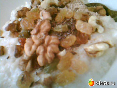 1-й завтрак - фреш (1 фрукт), кофе, овсяная каша на молоке с изюмом, орехами, семенами льна и клетчаткой (злаки + белок):