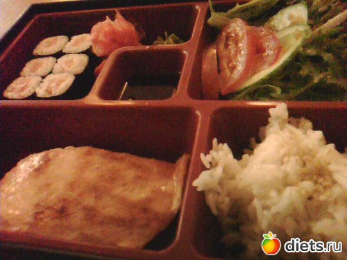 А в бенто было филе лосося, рис на пару, роллы с лососем, зеленый микс-салат: