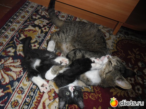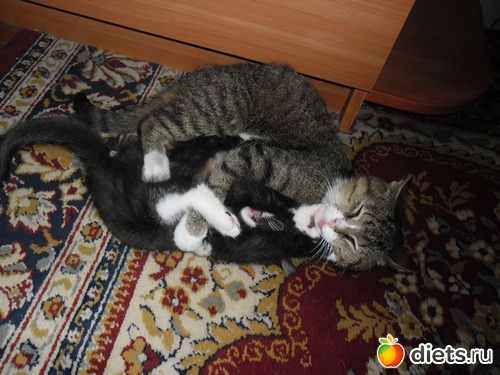 Зафиксировала! Он её так достает, что она начинает злиться. А иногда ляжет, глаза закроет, типа спит. А сама хвостом шевелит. Парень играется с её хвостом, мамаша дрыхнет - все довольны.
