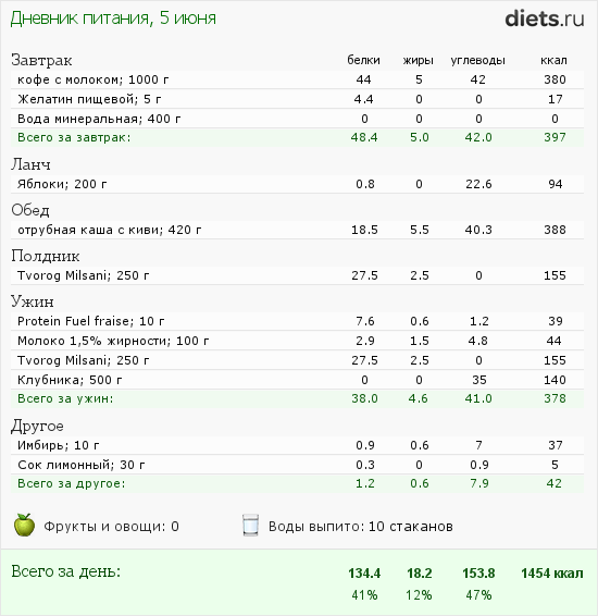 А кофе , это я счетала как из молока обезжиреного. Я обычно дома пью молоко + кофе растваримый. Тут на работе из авьтомата. Выпила конечно меньше чем литр. просто он мне кажеться жирным и калорииным ипоэтому так забиваю. Я по у рам есть перестала