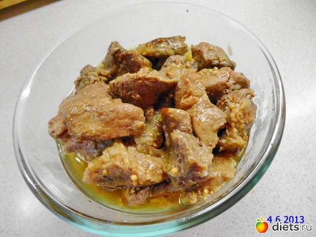Мясо порезала на кусочки размером в половину спичечного коробка, посыпала солью, специями, добавила горчицу и перемешала. Накрыла крышкой и оставила в сторонку.