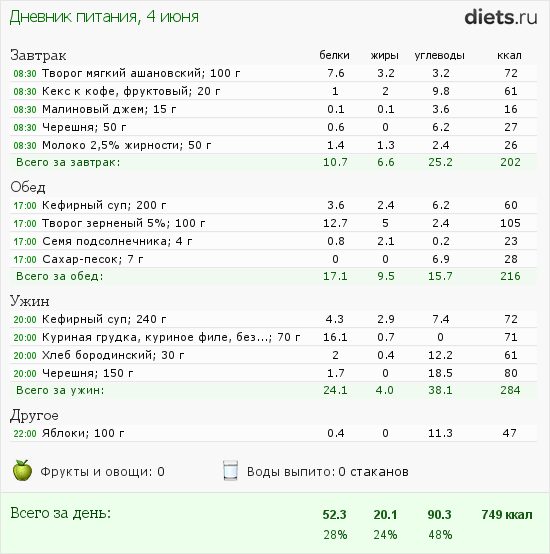 Потихоньку рацион корректируется - в сторону замещения жиров белками и снижения калорийности. 4-го вообще получился разгрузочный день на 750 ккал - совершенно неожиданно для меня. Большую часть дня провела с своем спортклубе, есть было некогда, а потом уже к вечеру и не особо хотелось.
