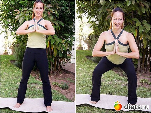 Встаньте, расставив ноги на ширине бедер, распрямите грудь, плечи откиньте назад, напрягите пресс, согните локти, ладони сведите вместе перед собой (пальцами вверх). Сохраняя вертикальное положение тела, сделайте вдох и приседайте, пока бедра не будут параллельно полу (не опускайтесь ниже 90°). Следите за тем, чтобы колени не выходили за линией пальцев ног. Затем, опираясь на пятки, выдохните и выпрямите ноги, чтобы вернуться в исходное положение. Повторите упражнение 12 раз.