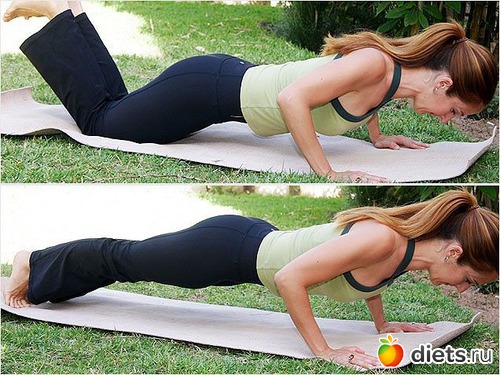 Исходное положение — планка (руки точно под плечами, пальцы направлены вперед, пресс напряжен, спина ровная, колени опираются о пол). Затем, сгибая локти, медленно опускайте грудь к полу на два счета (голова должна оставаться на одном уровне со спиной). Выпрямите руки, чтобы вернуться в исходное положение — задержитесь на два счета. Повторите упражнение 12 раз.