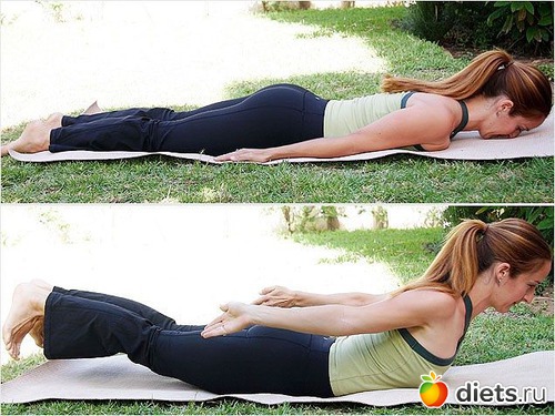 Ноги поставьте вместе, распрямите грудь, плечи откиньте назад, напрягите пресс, руки вытяните над головой. Подайтесь вперед, руками дотроньтесь пола и «пройдите» ими в положение планки (руки точно под плечами, пальцы направлены вперед, пресс напряжен, спина ровная, колени (или пальцы ног) опираются о пол позади вас). Сожмите ягодицы, опускайте бедра к полу, а голову поднимайте вверх, направляя плечи вниз и назад. Не слишком выгибайте спину и не закидывайте голову назад. Теперь измените движение. Во-первых, вернитесь в положение планки, опираясь ногами, «пройдите» руками обратно, пока не окажетесь снова в согнутой позе. Полностью выпрямитесь и поднимите руки над собой. Повторите упражнение 12 раз.