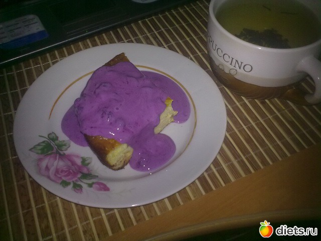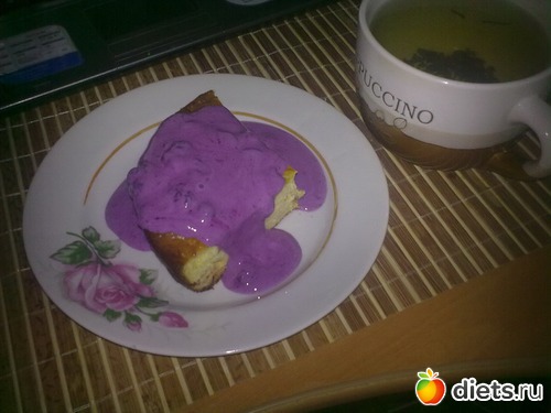 Последний кусочек запеканки с соусом из йогурта и голубики (и почему я раньше не понимала, что у йогурта вкус практически такой как у сметаны, а калорий меньше). Такой яркий цвет получился, да?