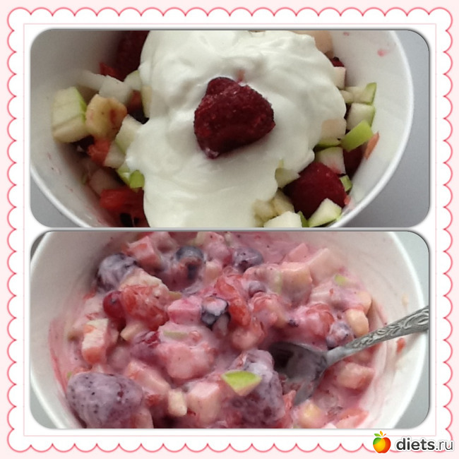 Фруктовый салатик Вкусный и полезный фруктовый салатик на второй завтрак был у меня сегодня)) Калорийность на вполне большую и сытную порцию - 160 ккал.