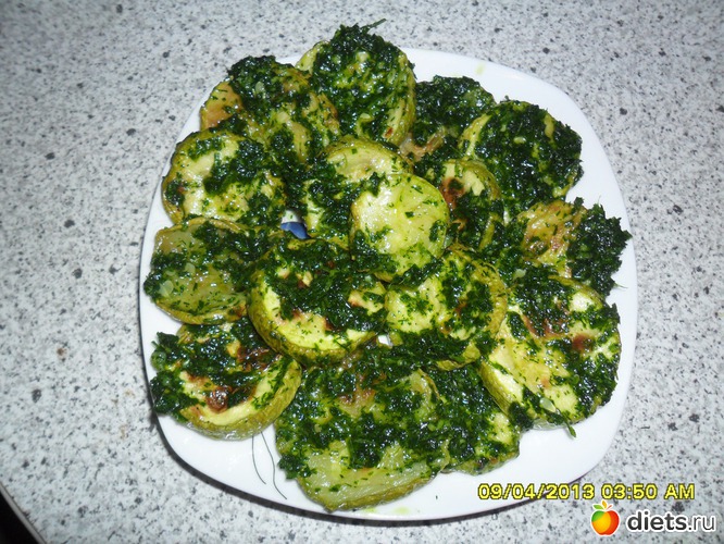 Каждый, кто худеет знает, что майонез - это враг № 1, а ведь лето... пора кабачков, которые очень хочется пожарить и перемазать майонезом с чесноком. И вот я нашла выход. Итак, кабачки нарезать кружечками, как для жарки, сложить а пакет, посолить и добавить немножко оливкового (или любого другого растительного) масла. Все это в пакете хорошо перемешать и выложить (разумеется в один слой) на застеленный пергаментом протвень. Духовку я ставила на максимальную температуру и когда она хорошо прогрелась, поставила туда свои кабачки. Минут через 10 я оставила только гриль и готовила до тех пор, пока не появилась золотистая корочка (все духовки разные, поэтому лучше подбирать время опытным путем, как и я в первые разы). Пока кабачки оставали я сделала заправку, для которой нужно взять любую зелень, которую Вы любите (я брала укроп и петрушку), чеснок по вкусу, соль и оливковое масло (если масло подсолнечное, то я думаю лучше брать домашнее, что бы запах был). Все ингридиенты сложить в чашку блендера и хорошо взбить. Получилось намного вкуснее, чем с майонезом (хотя может это на мой диетический вкус