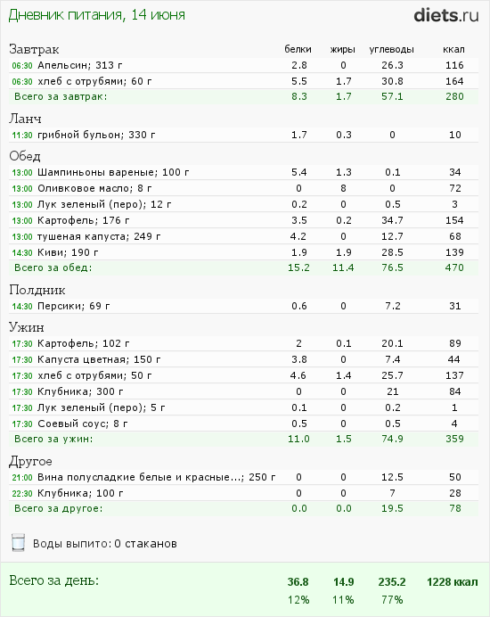 Отварная цветная капуста (150 г) с соевым соусом; картофелина в мундире, кусок хлеба с отрубями, чай с сахарозаменителем.