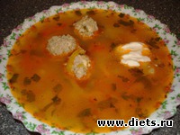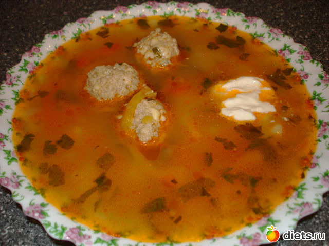 Сыр натереть на крупной терке, 1 луковицу мелко нашинковать, все добавить к фаршу, посолить, поперчить, приправить специями для фарша. Слепить из фарша фрикадельки и отправить в кастрюлю с кипящей водой. Морковь натереть на крупной терке, луковицу нарезать, болгарский перец соломкой, все обжарить на растительном масле. Тем временем картофель нарезать и отправить в кастрюлю. Минут за 10 до конца в кастрюлю высыпать промытую чечевицу. Зажарку заправить томатной пастой, выложить в кастрюлю, посолить, поперчить, добавить специи (на ваше усмотрение), в самом конце добавить рубленную зелень.