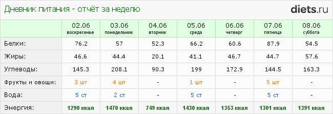 На подсчете с 29 мая. Практически ни разу не превышала 1500 ккал, в среднем - 1300 в день. Пока забываю считать фрукты-овощи и воду. Удается пить от 2 до 5 стаканов чистой воды в день. Но в целом табличке все выглядит красиво, хотя надо стремиться снижать жиры. Даже получилось питаться по методике "зиг-заг". Физнагрузки в среднем 2 раза в неделю: один раз тренажерка и один - бассейн. Подключила два раза в неделю роликовый массаж и прессотерапию. Однако вес и ныне там - все те же 56 с половиной килограммов. Мне даже интересно: когда организм поддастся, наконец, и порадует меня отвесом?