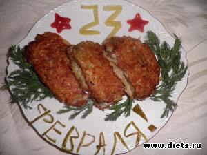 Я делала наподобие. Тут правильнее написать : положить на ладонь тертый картофель, сделать лепешку и ею облепить кусок рыбы.