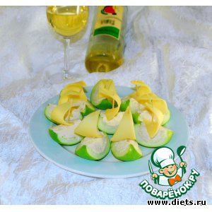 В каждую яблочную лодочку кладем начинку, кусочек сыра надевем на зубочистку в виде паруса и втыкаем в лодочку. Выкладываем на тарелку, можно украсить свежей зеленью по желанию.