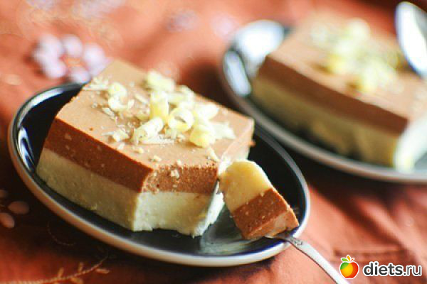 В форму заливаем светлый слой и отправляем в холодильник до застывания. Или же можно ставить форму в морозильную камеру минут на 15 – 20. Когда первый слой застынет, заливаем второй и снова отправляем застывать. Когда десерт полностью застынет, его можно нарезать на порционные кусочки и украсить фруктами или шоколадом. Забирайте на стену, чтобы не потерять.