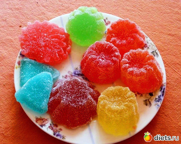 После застывания желе вырезать фигурными формочками мармеладинки и каждый кусочек обвалять в сахаре. Если любите мармелад с кислинкой, добавьте в сахар немного сухой лимонной кислоты.