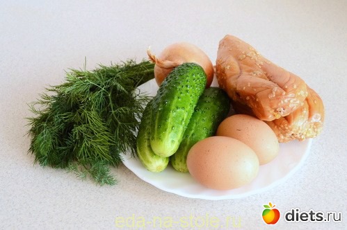 1) Для приготовления салатика нужно подготовить: куриное копченое филе, огурец, яйца, лук, 9% уксус столовый, майонез, масло рафинированное и немного зелени для украшения.