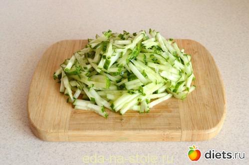 9) Огурец можно нашинковать тонкой соломкой или же порезать кубиками.