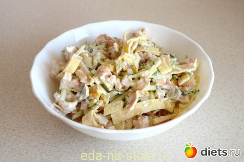 Необычный и оригинальный вкус данному салату придают блинчики из яиц и копченая курица. Такое сочетание ингредиентов позволяет быстро насытиться им мужчинам, а женщинам, которые пристально следят за фигурой, копченую курицу можно заменить вареным куриным филе.
