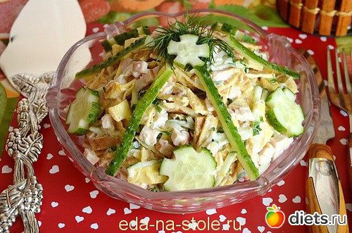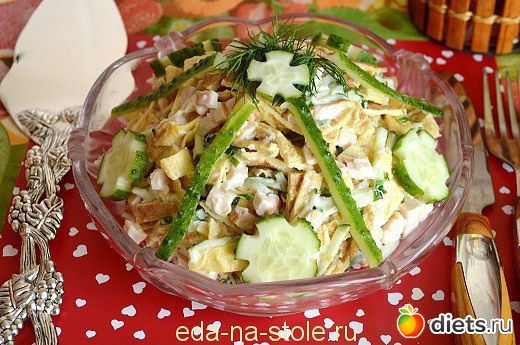 Необычный и оригинальный вкус данному салату придают блинчики из яиц и копченая курица. Такое сочетание ингредиентов позволяет быстро насытиться им мужчинам, а женщинам, которые пристально следят за фигурой, копченую курицу можно заменить вареным куриным филе.