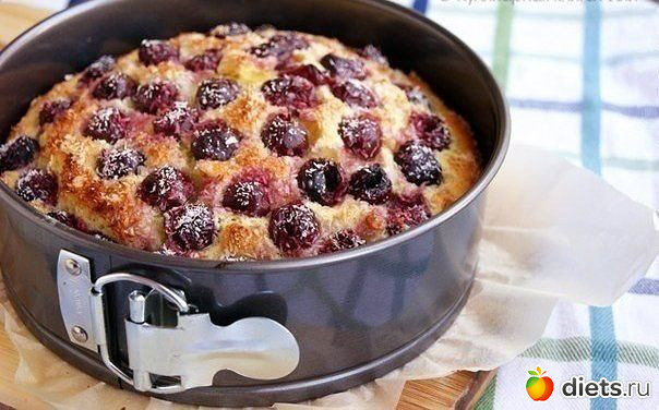 Вишню откинуть на сито и дать хорошо стечь жидкости. Если ягоды с косточками, убрать косточки. Для теста соединить яйца, размягченное сливочное масло и сахар. Перемешать с помощью миксера. Добавить сметану, разрыхлитель. Взбить. Затем добавить просеянную муку. Муки может потребоваться чуть меньше. Тщательно перемешать. При желании, можно опять взбить миксером. Тесто должно быть густое, но льющееся. Выложить тесто в форму (d 24 см.). Если будете использовать разъемную форму, то ее лучше проложить бумагой для выпечки. На тесто выложить вишню. Присыпать кокосовой стружкой. Печь в разогретой до 180 С духовке 20-25 минут.