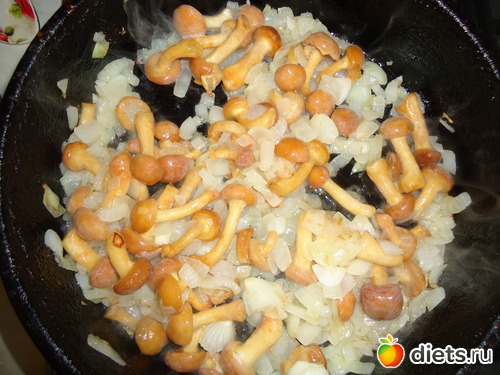 Обжариваем грибы и нарезанный лук, слегка солим и перчим