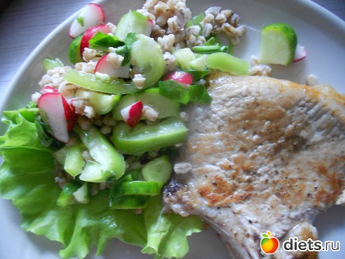а почему на ужин суп-пюре из редиса и постная свиная отбивная с салатом из перловки с овощами? Насколько я понимаю,в Пятнашках для похудения не едят углеводы на ужин