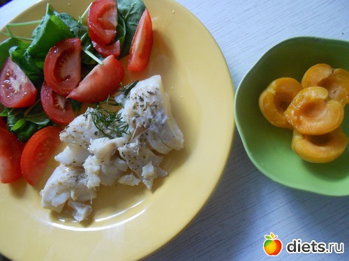 Ужин - треска на пару (на ломтиках лимона и с укропом), шпинат с помидором, абрикосы: