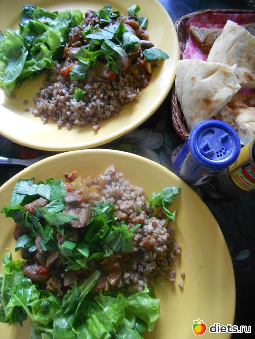Я себе взяла 200 г тжвжика и 100 г гречневой каши, а еще зеленый салат, 20 г, заправлен лимоном.