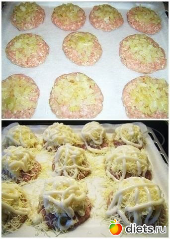 Сделать из фарша небольшие круглые лепешки (диаметр 10 см). Выложить на противень, смазанный растительным маслом или застеленный пекарской бумагой.
