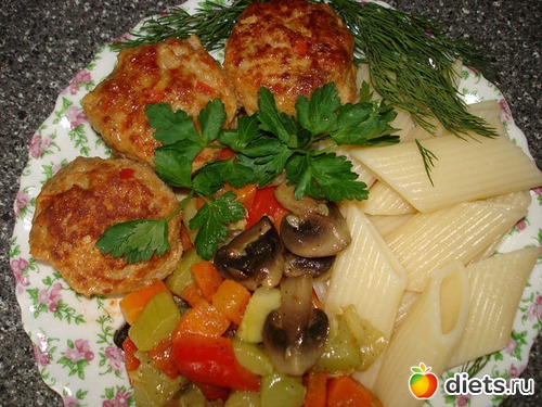 Хлеб залить молоком, луковицу и чеснок мелко нарезать. Морковь, перец и цуккини почистить, половину нарезать мелко(пойдет в фарш), а остальное порезать покрупнее(на гарнир). В фарш добавить мелко порезанные овощи, лук, чеснок, хлеб, яйцо, поперчить и посолить по вкусу, хорошо вымешать, сформовать небольшие тефтельки. На сковороде в масле обжарить овощи(для гарнира, я к овощам добавила несколько шампиньонов, так же порезав)жарить не долго, минут 10-15, в конце посыпала морской солью с травками и выложить на тарелку, в этой же сковороде обжарить тефтельки, в конце добавить немного кипяченой воды разведенной с томатной пастой и потушить под крышкой на медленном огне минут 5-10, на фото тефтели при подаче с овощами и макаронами