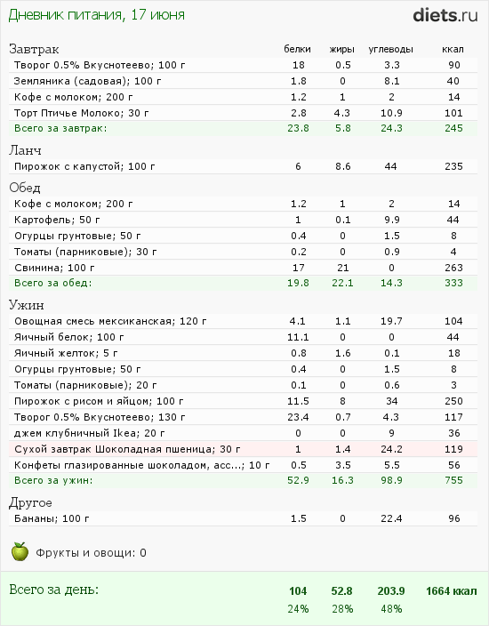 Ужасно я питалась последние две недели. Просто кошмарно)). Сегодня опять решила всё записать - грустно смотреть))). Постараюсь завтра вести себя лучше))