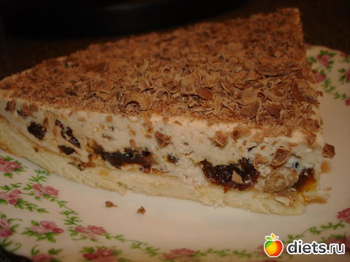 Желатин замочить в небольшом кол-ве холодной воды, затем нагреть, чтобы растворился(не кипятить). Перемешать творожную массу, сметану, сахар(сахарную пудру)и чернослив порезанный, добавить желатин, все тщательно перемешать. На готовый корж прямо в форме выложить начинку и поставить в холодильник до полного застывания, вынуть из формы и сверху посыпать натертым шоколадом